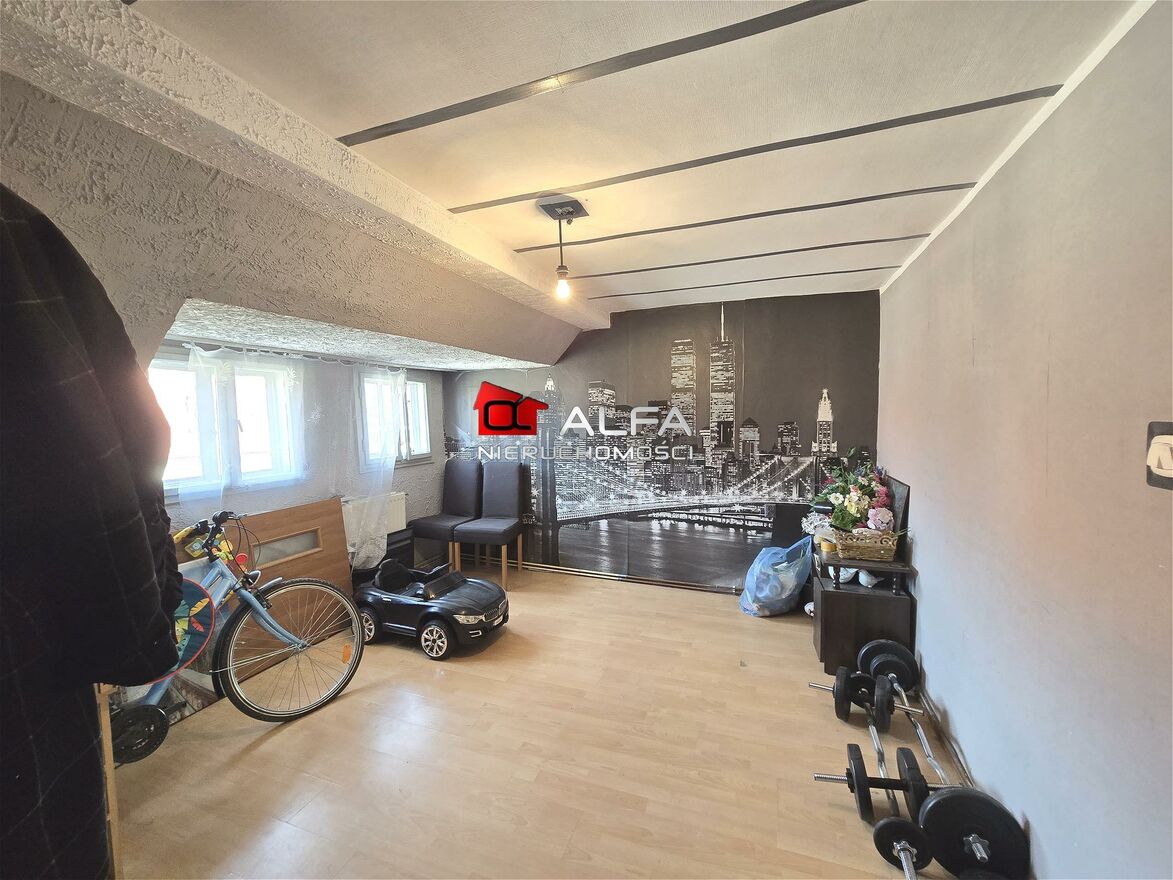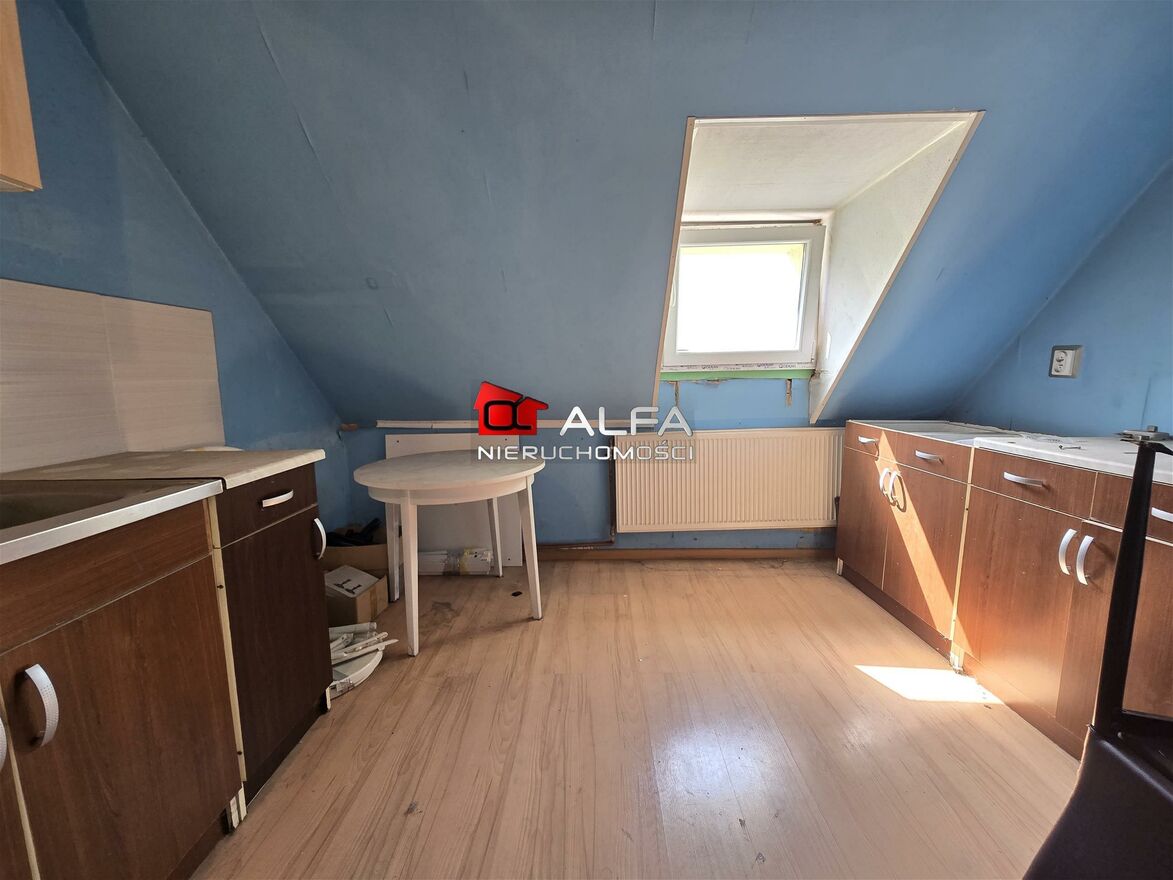 Dodatkowo w skład nieruchomości wchodzą dwa pokoje znajdujące się na poddaszu (do obu doprowadzone ogrzewanie, a do jednego również woda)